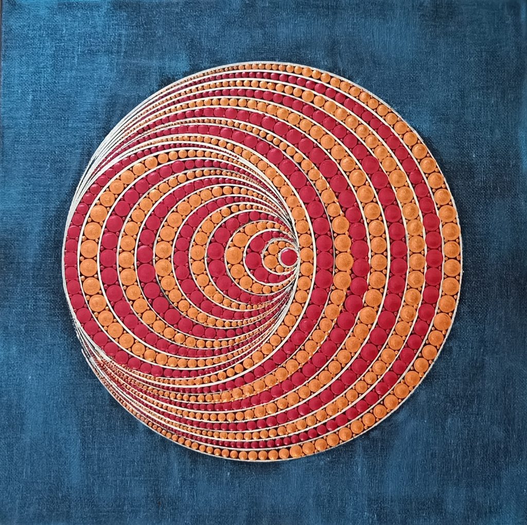 A pontozó technika kiválóan alkalmas a 3D hatás megjelenítésére. Ezeket a képeket is feszített vászonra készítem, tehát a látvánnyal ellentétben abszolút sík felületre festek – pontosabban pontozok – akrilfestékkel.